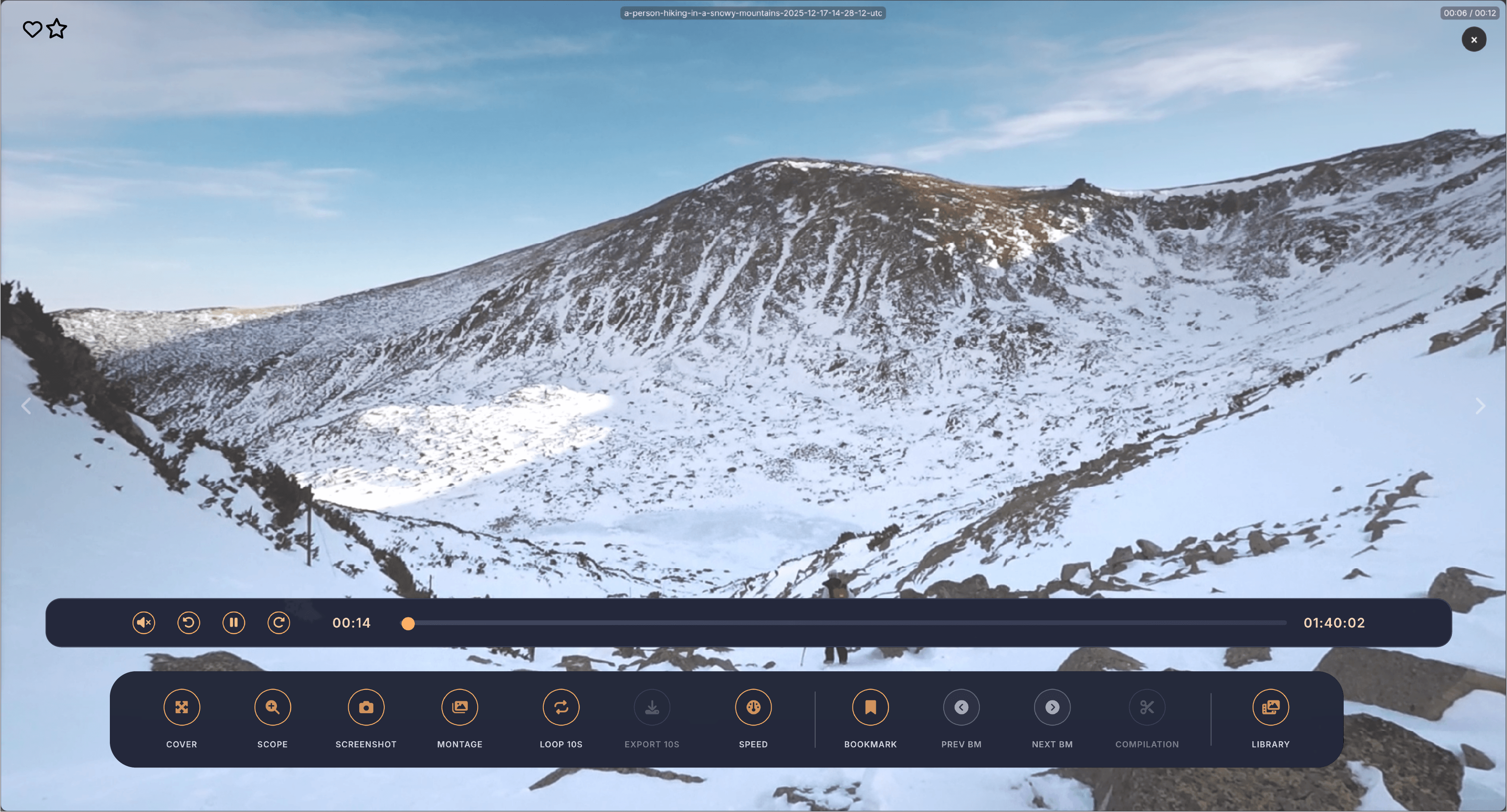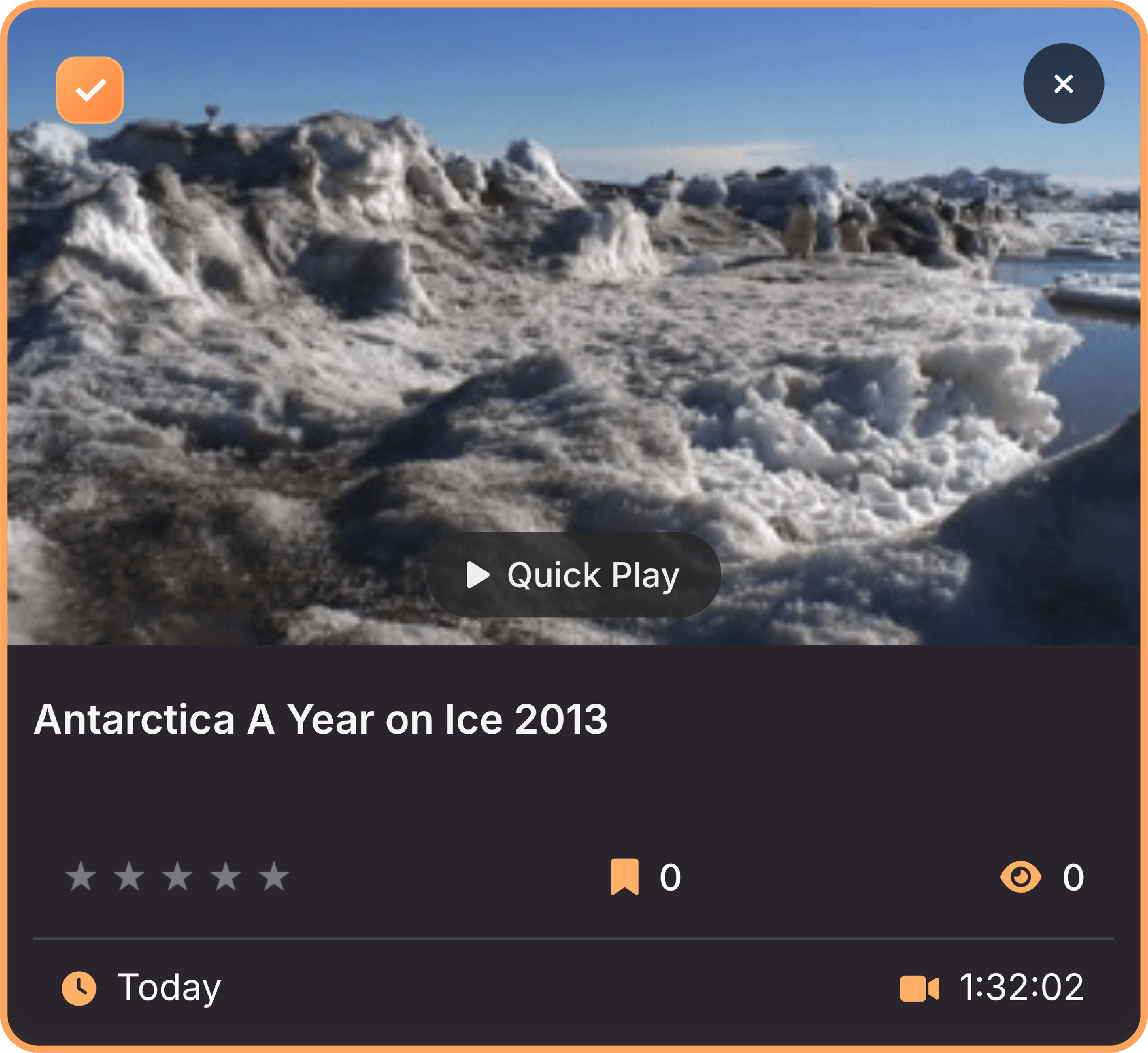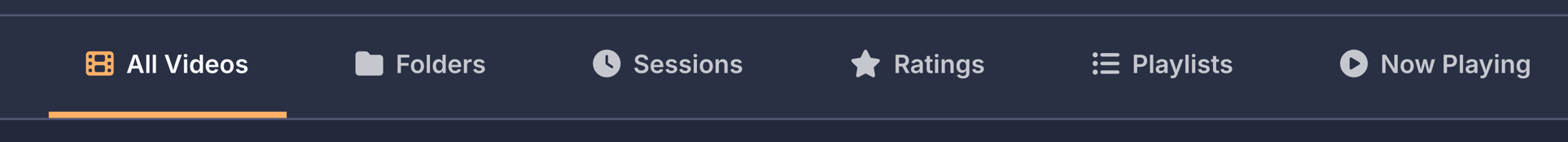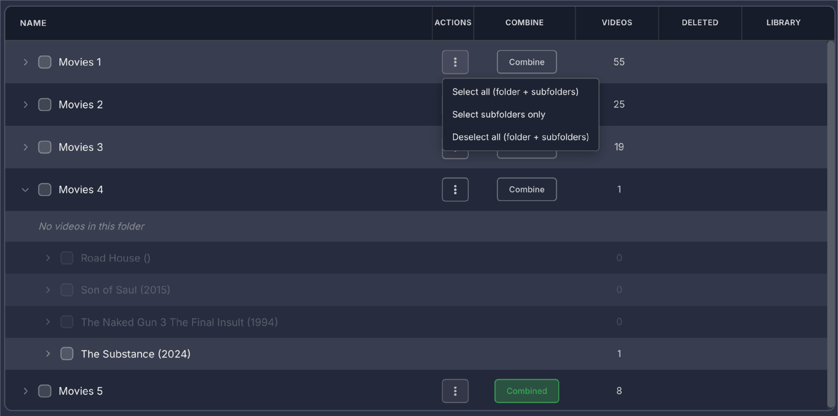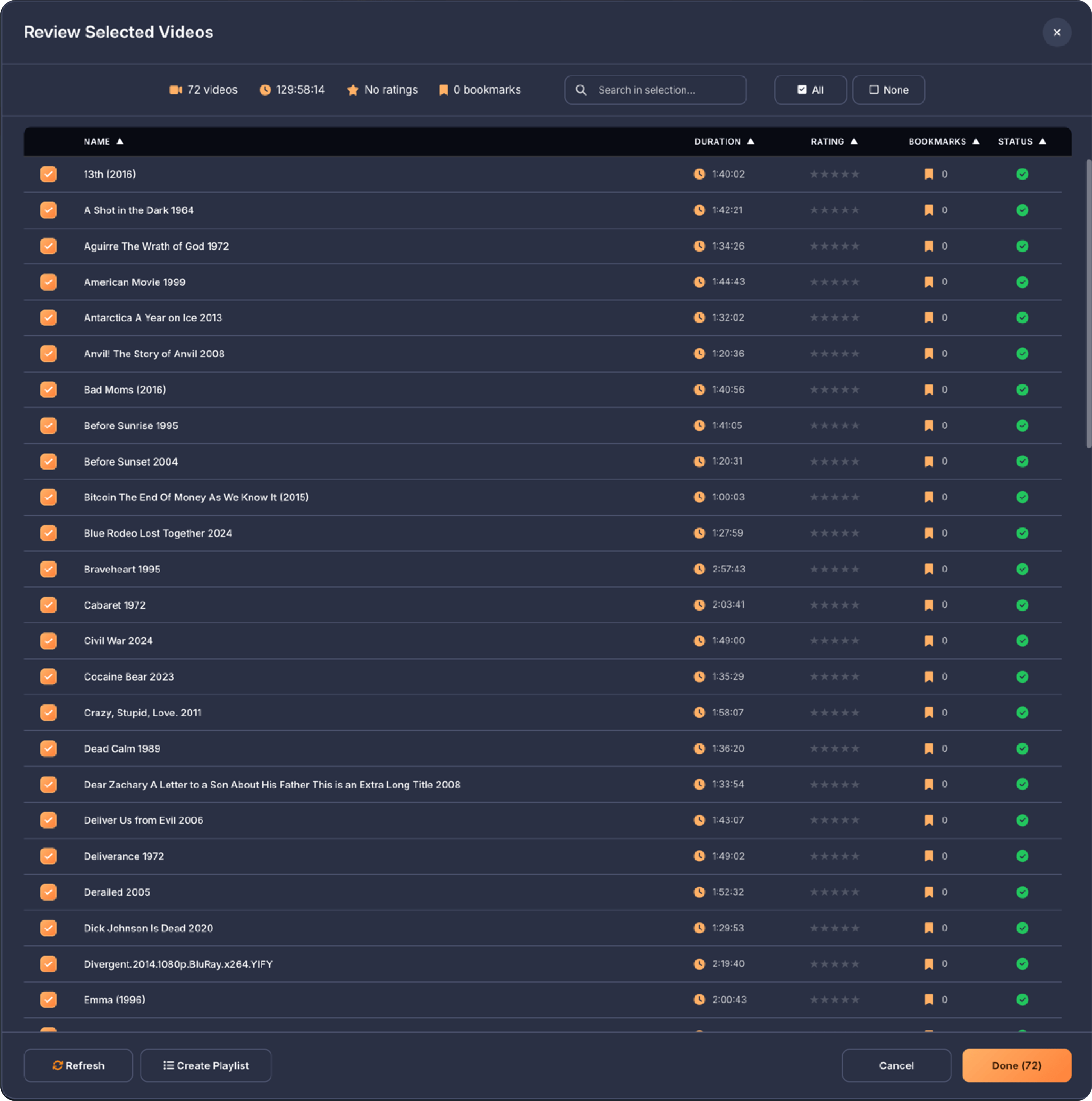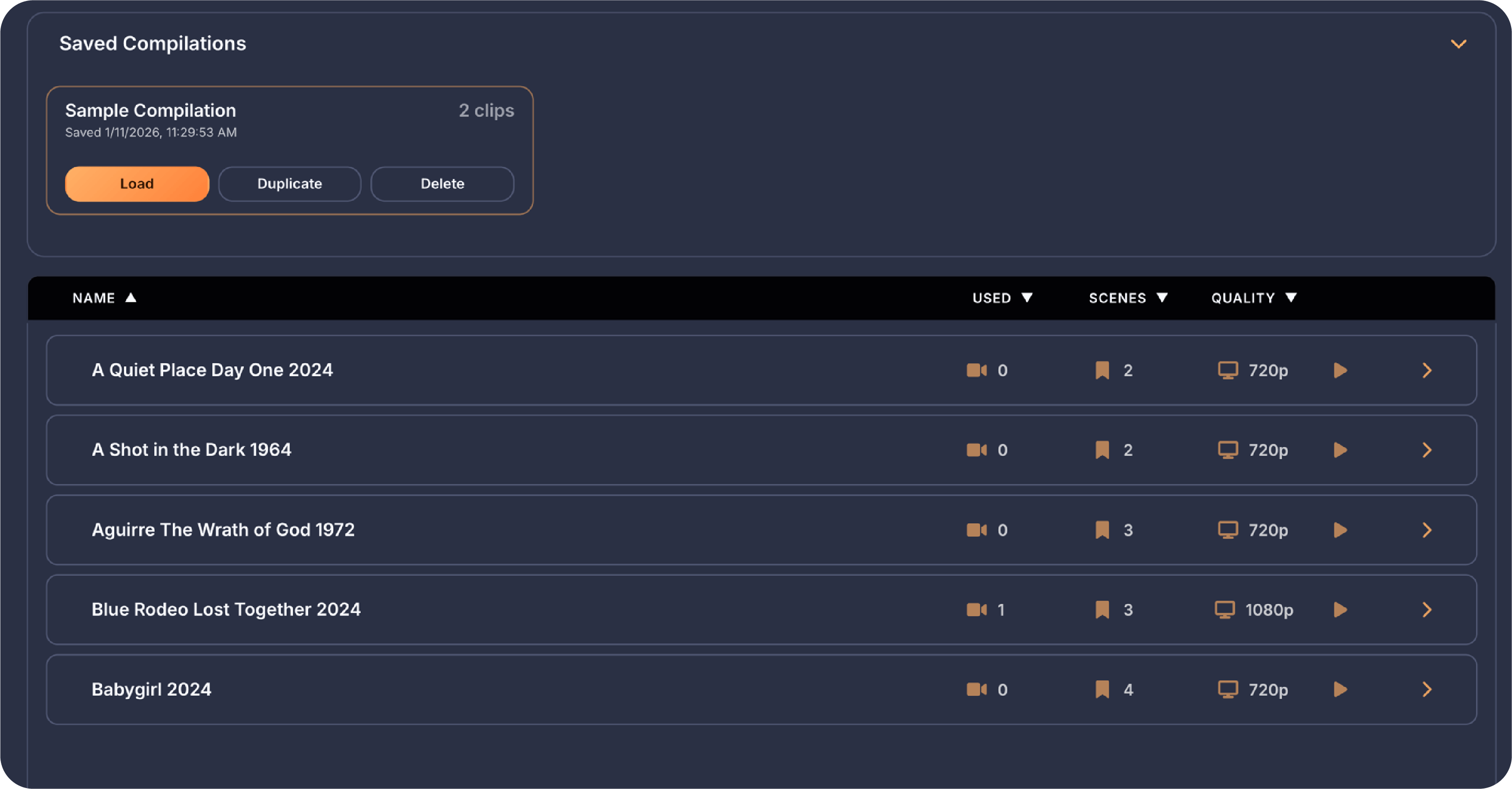 Below the filters on the left side, your bookmarks are displayed as rows organized by video. Each row shows the video name on the left, followed by three columns showing how many times that video has been used in compilations, how many bookmarked scenes it has, and what quality the video is. If a video file is unavailable because it was moved, deleted, or the drive is offline, the row appears dimmed and shows Off for the quality. On the right side of each row are three buttons. The play button opens that video in fullscreen mode so you can add, edit, or remove bookmarks, then returns you to the compilation screen when you exit fullscreen. The X button deletes all bookmarks for that video. The chevron button expands the row to show all the individual bookmarked moments as thumbnail tiles.