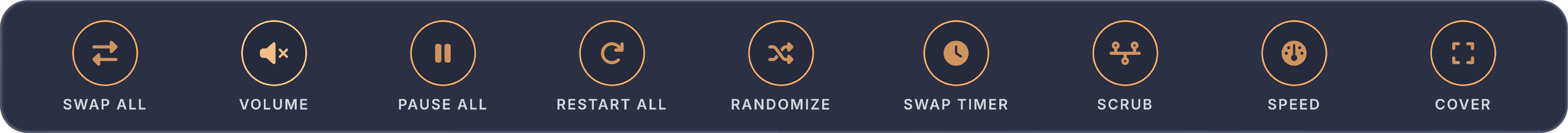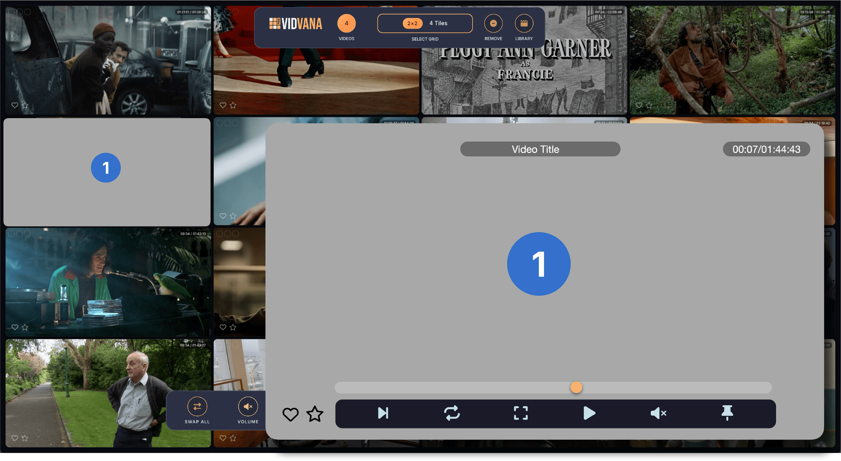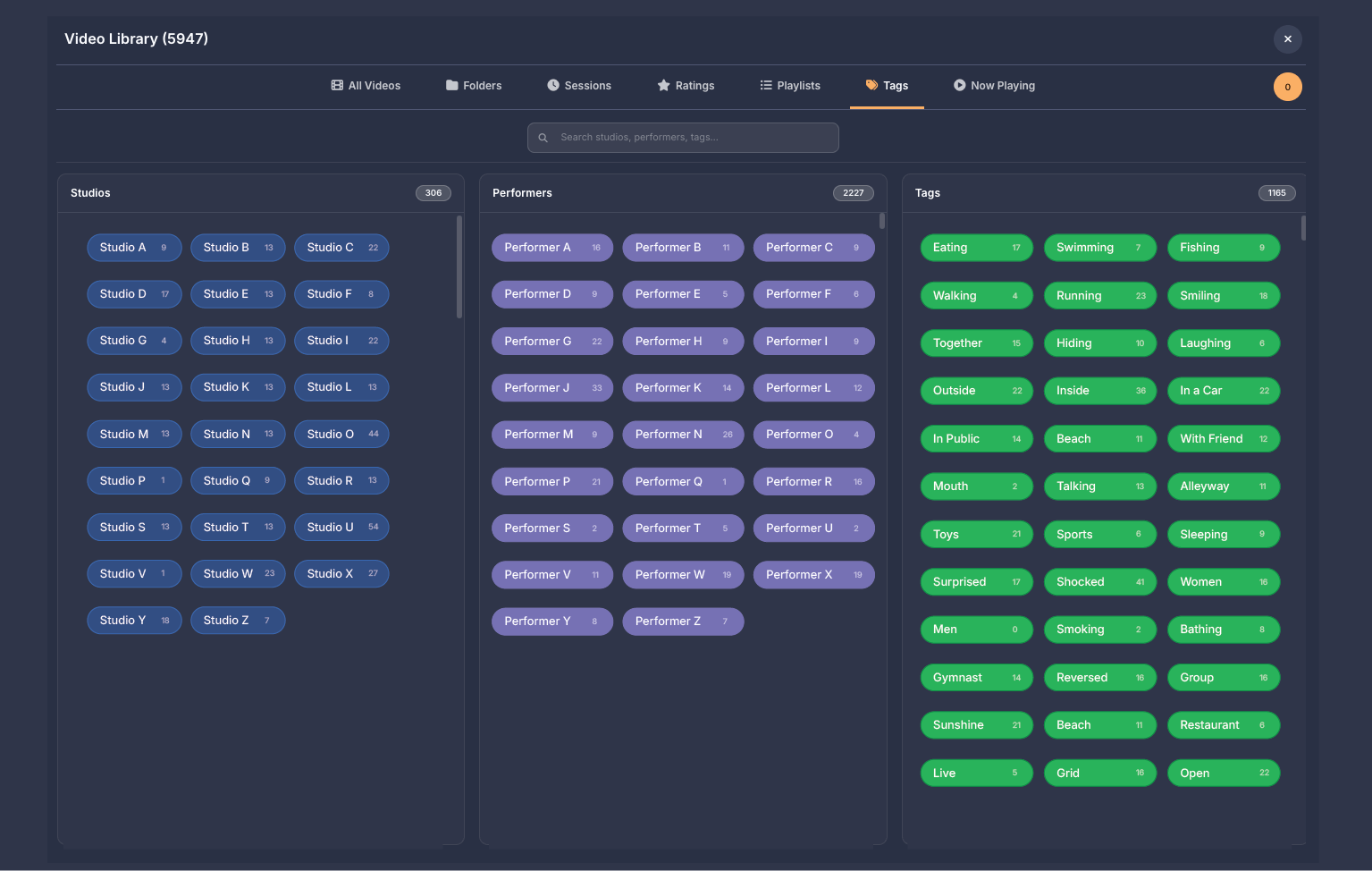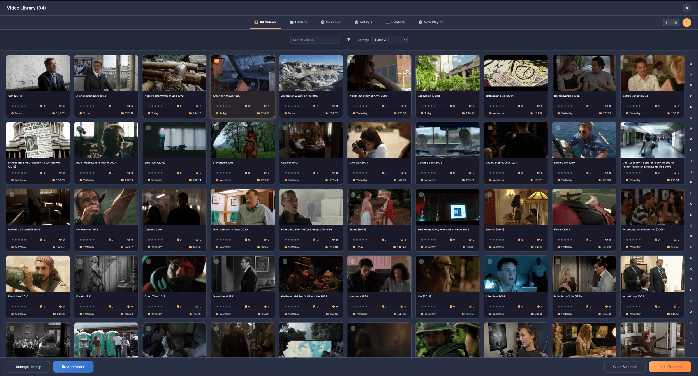 Below the filters on the left side, your bookmarks are displayed as rows organized by video. Each row shows the video name on the left, followed by three columns showing how many times that video has been used in compilations, how many bookmarked scenes it has, and what quality the video is. If a video file is unavailable because it was moved, deleted, or the drive is offline, the row appears dimmed and shows Off for the quality. On the right side of each row are three buttons. The play button opens that video in fullscreen mode so you can add, edit, or remove bookmarks, then returns you to the compilation screen when you exit fullscreen. The X button deletes all bookmarks for that video. The chevron button expands the row to show all the individual bookmarked moments as thumbnail tiles.