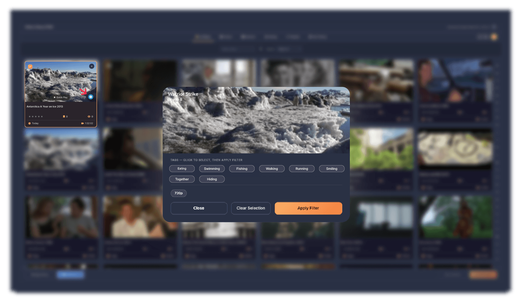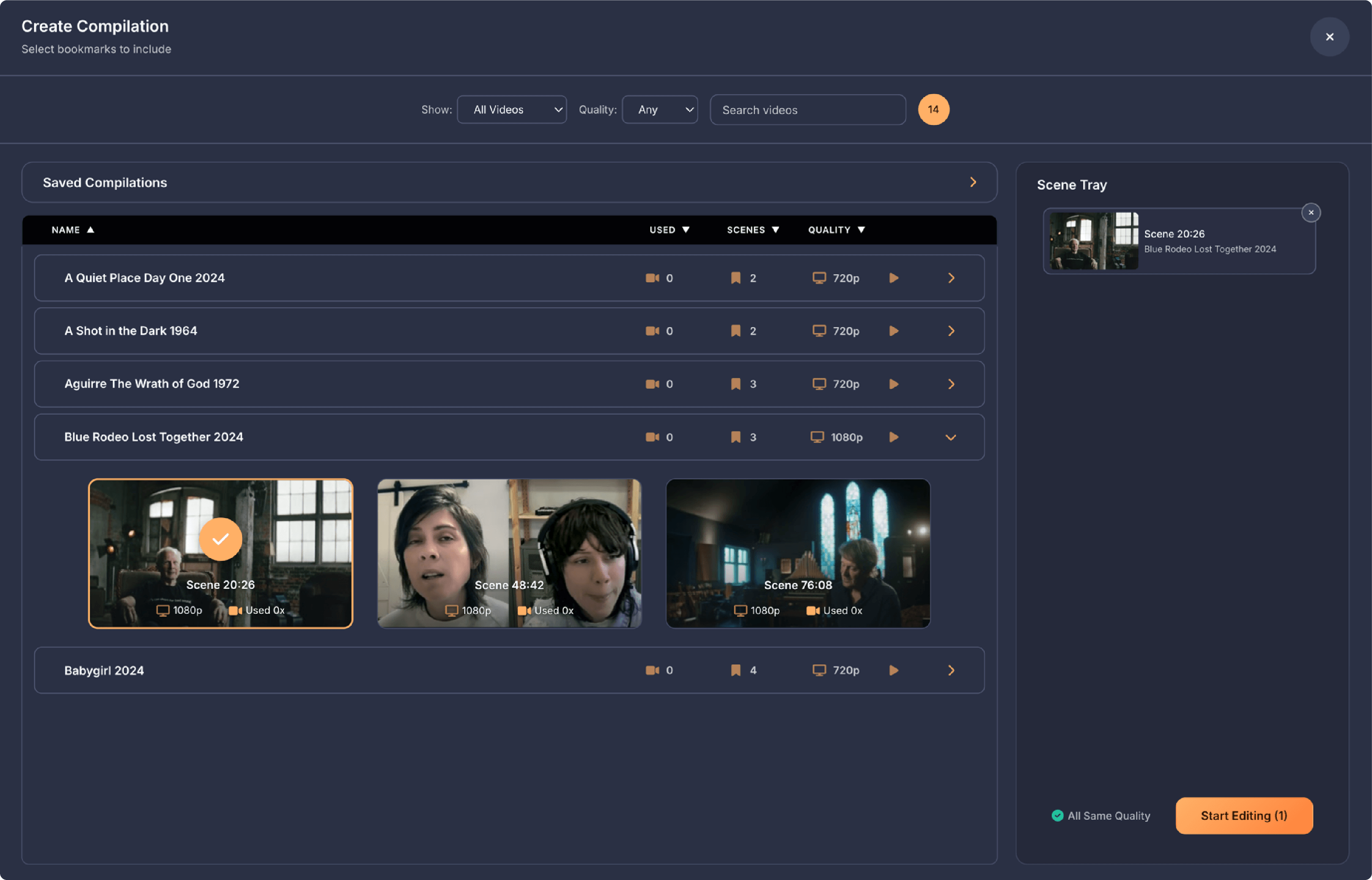 When you click a row to expand it, you'll see thumbnail tiles for each bookmarked moment. Each tile shows a preview image of that moment. Below the thumbnail is the scene timestamp showing where in the video that bookmark is located, the video name, and how many times that specific bookmark has been used in compilations. When you click a tile, it gets selected and added to the scene tray and a checkmark appears on it. You can also drag the bookmark into the Scene Tray. The tile also highlights with an orange border and checkmark to show it's selected. You can click it again to deselect it. On the right side of the screen is the Scene Tray, which shows all your selected bookmarks as small chips with thumbnails, scene timestamps, and video names. Each chip has an X button to remove it from your selection. Below the Scene Tray, a quality status indicator shows whether your selection is compatible across clips. If all your selected bookmarks are the same quality (4K, 1080p, 720p, or SD), it shows a green checkmark with All Same Quality. If you've mixed different video qualities, it shows a yellow warning triangle with Mixed Quality, because your final export will be limited to the lowest quality in your selection. When you select a bookmark that's lower quality than what you already have, a warning banner appears at the top explaining that this will limit your export quality, giving you the option to cancel or continue. You can check a box on the warning to stop seeing it for the rest of your session.