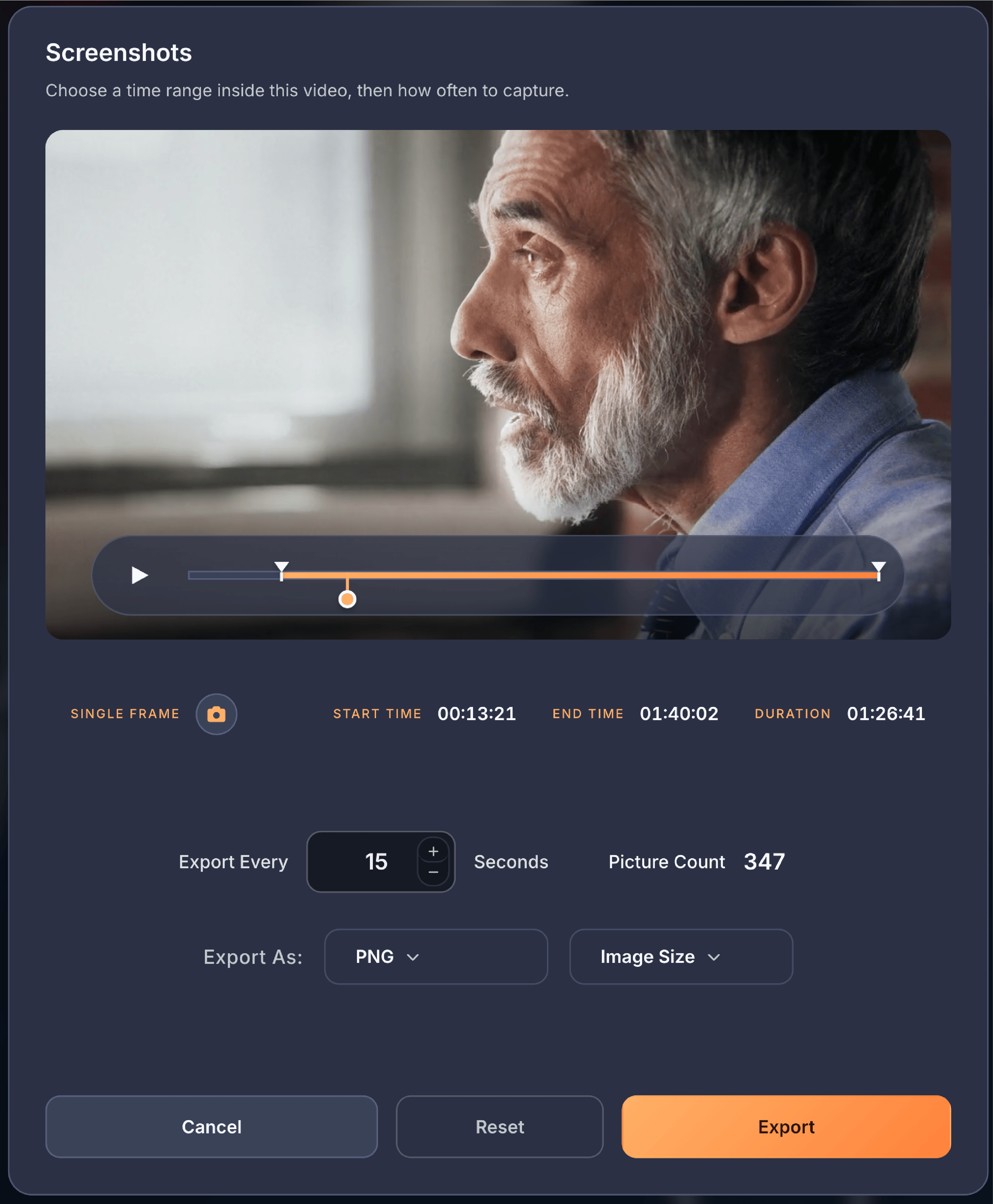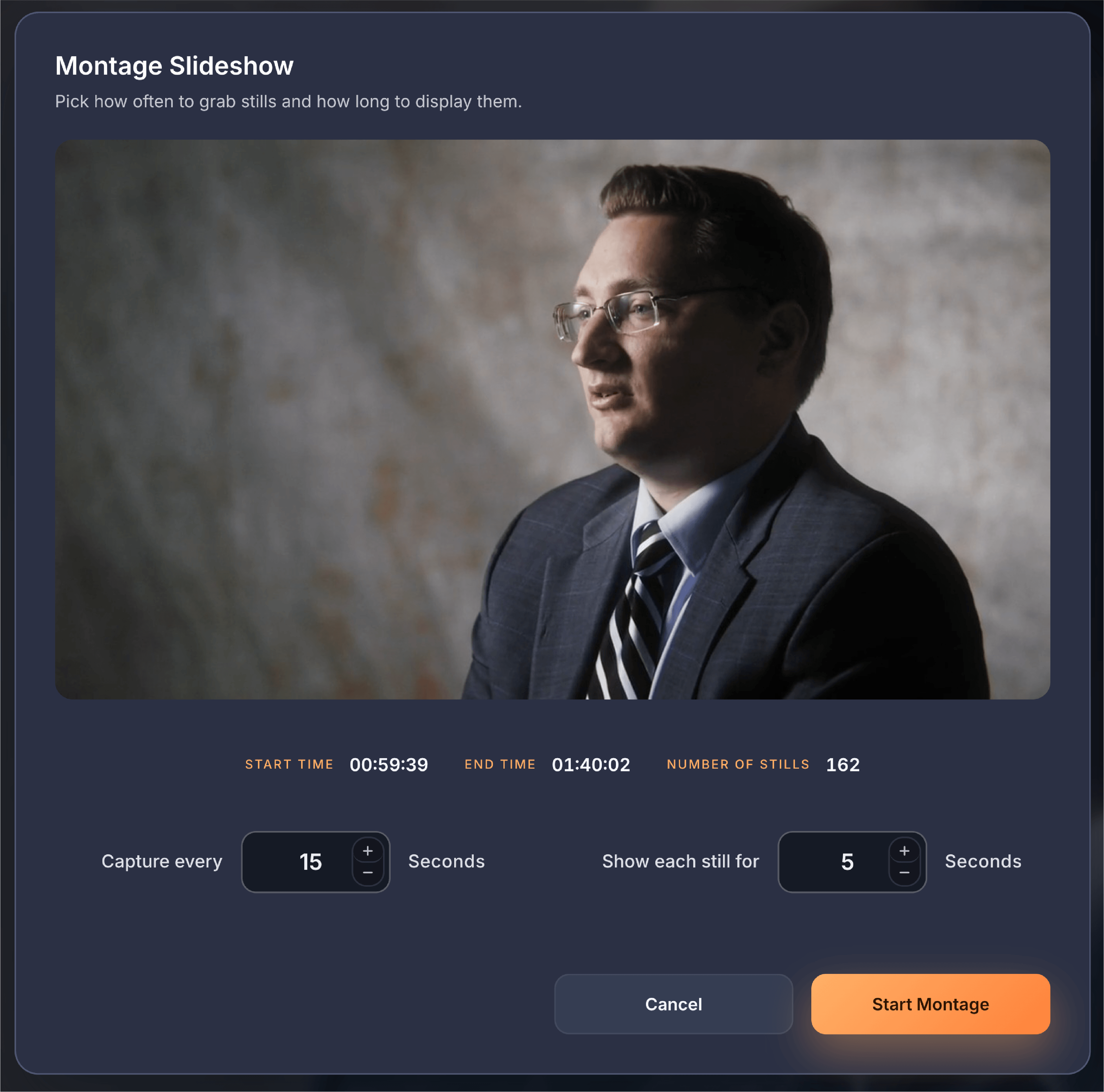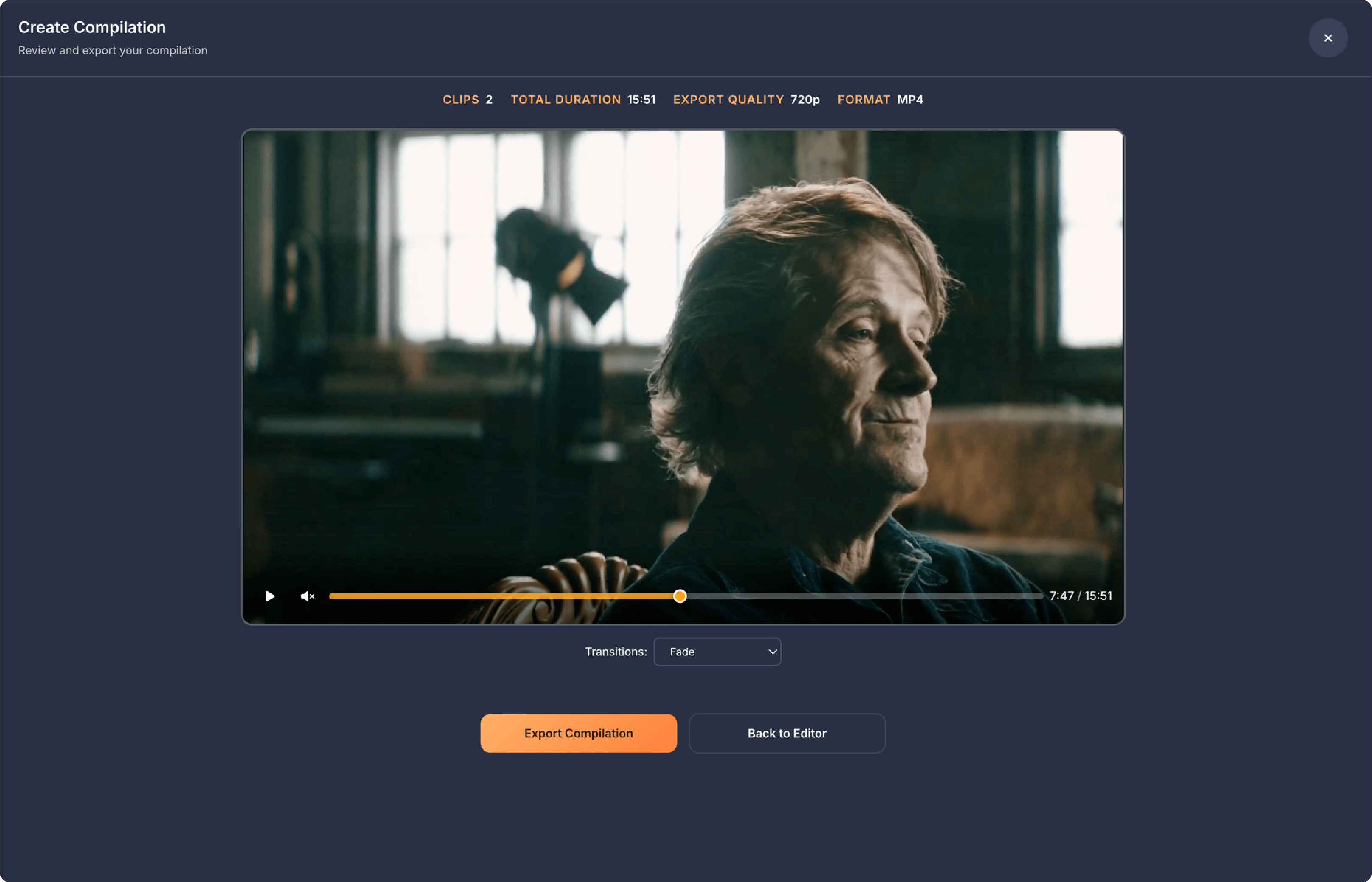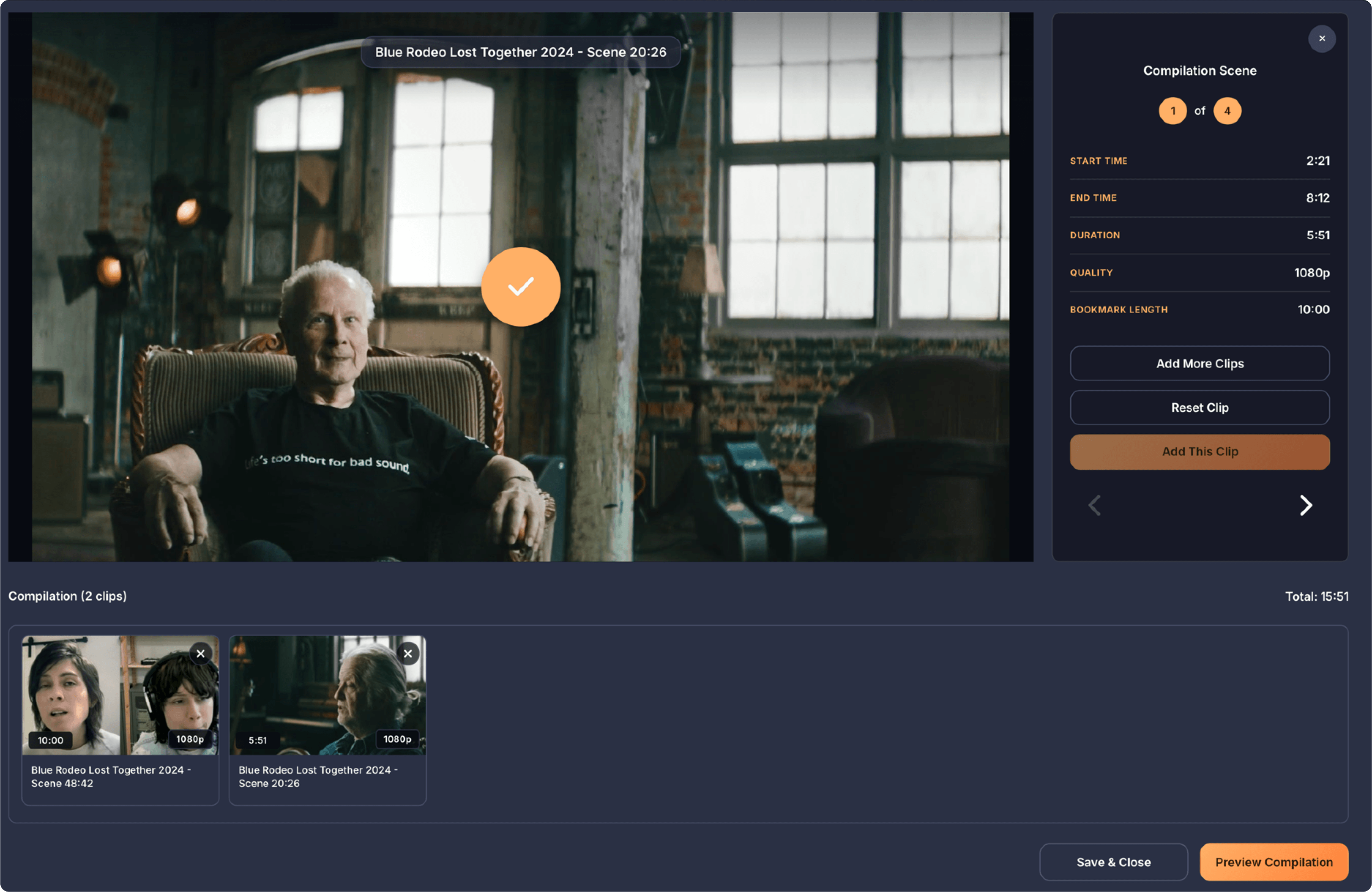 Once you've selected at least two bookmarks, the Start Editing button at the bottom of the Scene Tray becomes active and shows how many clips you've selected for your compilation. Clicking this button takes you to the next screen where you can trim each clip to the exact length you want.